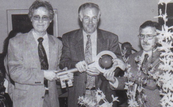 Am 20. April 1996 konnte das neue Sportheim eingeweiht werden. Diplom - Ingenieur Linus Fuchs und Bürgermeister Peter Kirchesch (von links) übergaben dem als Organisator und auch auf der Baustelle enorm engagierten Vereinschef Helmut Fromm den symbolischen Schlüssel.