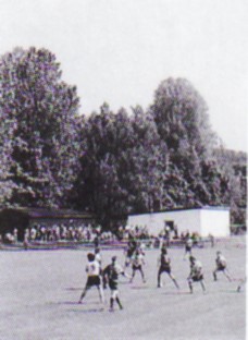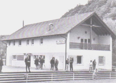 Alt und neu. Links die Holzbaracke, die viele Jahre als Gaststätte diente, sowie das eingeschossige Umkleide - und Duschgebäude. Rechts das umgebaute und aufgestockte neue Sportheim mit Gaststätte.