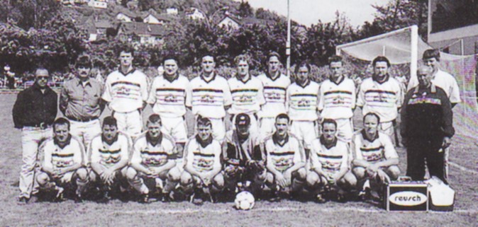 Die Mannschaft vor dem Relegationsspiel gegen den FC Östringen am 4.5.2001 in Reichartshausen. Hinten v. l.: J. Moraw, stv. Vorsitzender H. Schäfer, Vorsitzender H. Bauer, Ehrenvorsitzender H. Lauber, K. Rozic, M. Muratore, J. Mittelstädt, M. Barisic, S. Bechthold, M. Hack, G. Fuchs, A. Weber, stv. Vorsitzender G. Scherer, Betreuer A. Guida, Vorne v. l.: U. Neureuter, A. Walczak, M. Neuer, S. Geier, S. Bauer, T. Böttle, Spielertrainer G. Barisic, Co - Trainer F. Guida.