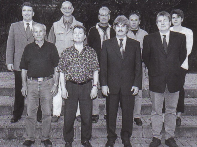 Die Vereinsführung im Jahr 2001 mit hinten v. l.: K. Zweidinger (Kassenwart), H. Riedinger (AH - Abteilung), H. Schäfer (stv. Vorsitzender), K. Martin (Spielausschussvorsitzender), B. Schmitt - Scherer (Festausschussvorsitzende), vorne v. l.: A. Guida (Spielausschussmitglied), J. Wandernoth (Schriftführer), H. Bauer (Vorsitzender), G. Scherer (stv. Vorsitzender).